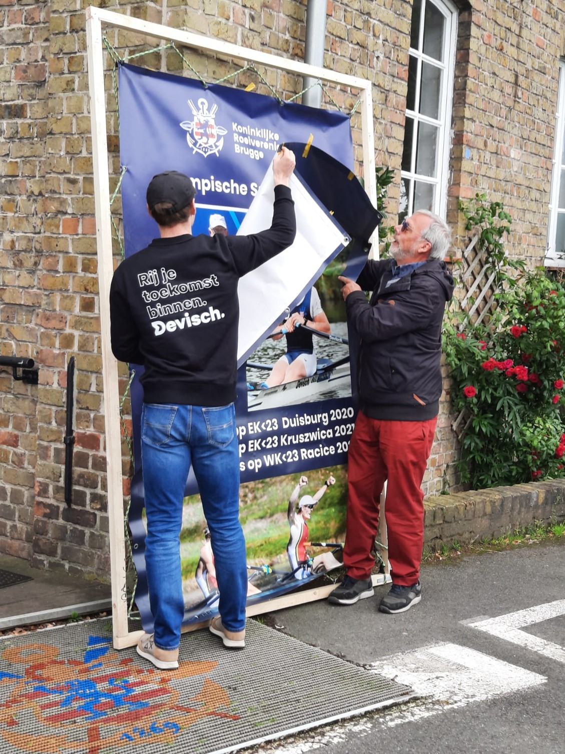 Een nieuwe banner werd opgehangen aan de gevel van de Koninklijke Roeiverening Brugge (KRB) om mijn kwalificatie voor de Olympische Spelen in de kijker te zetten.